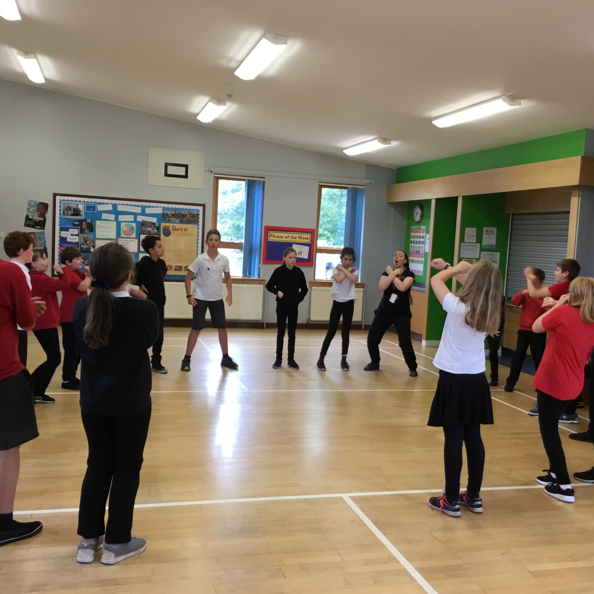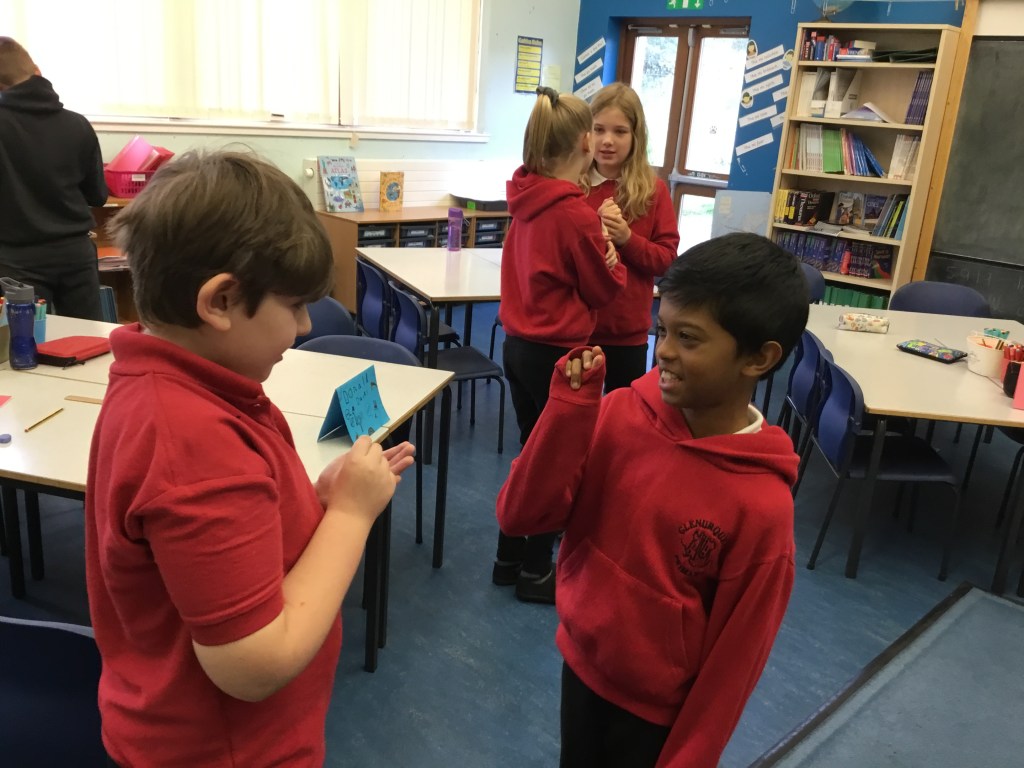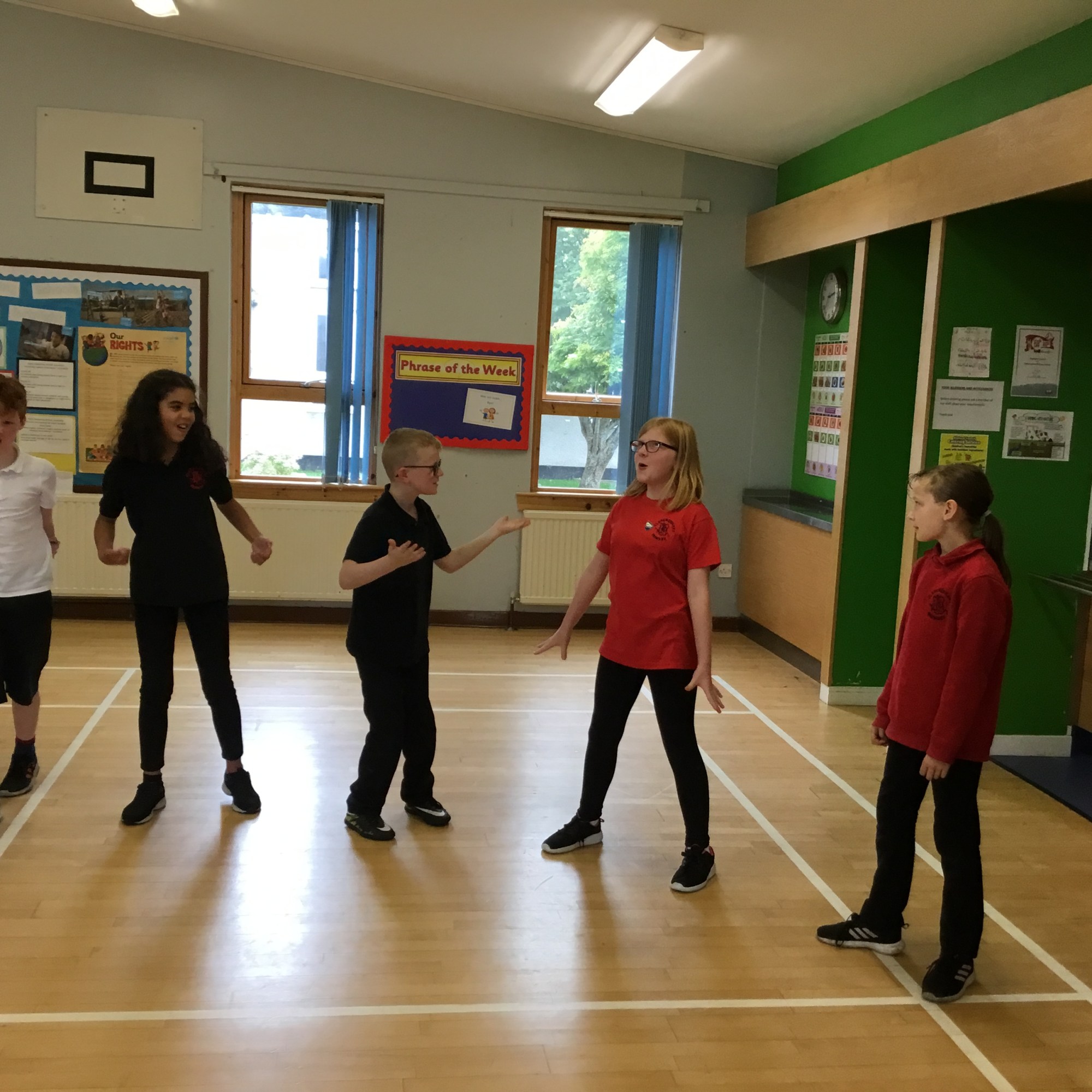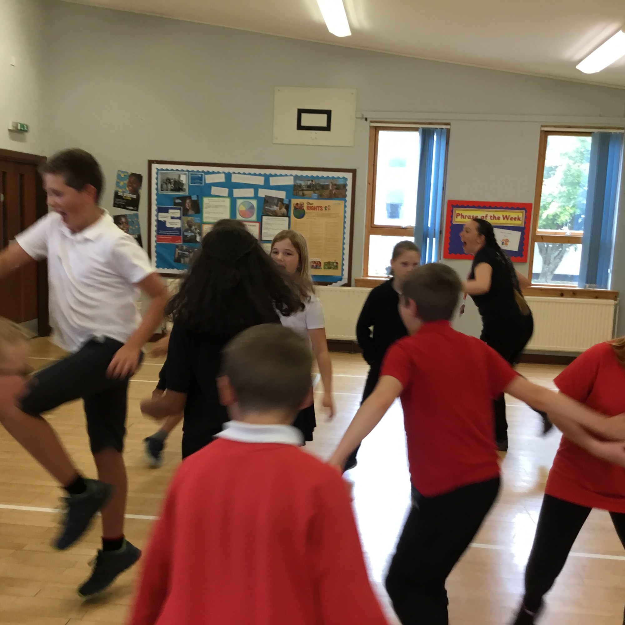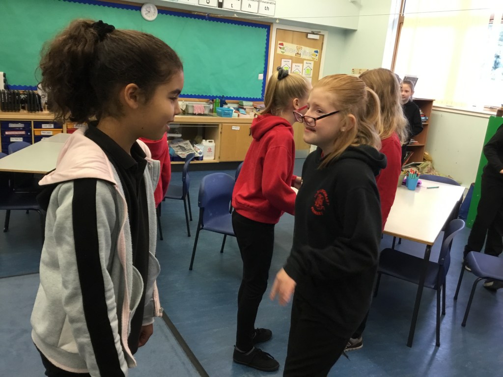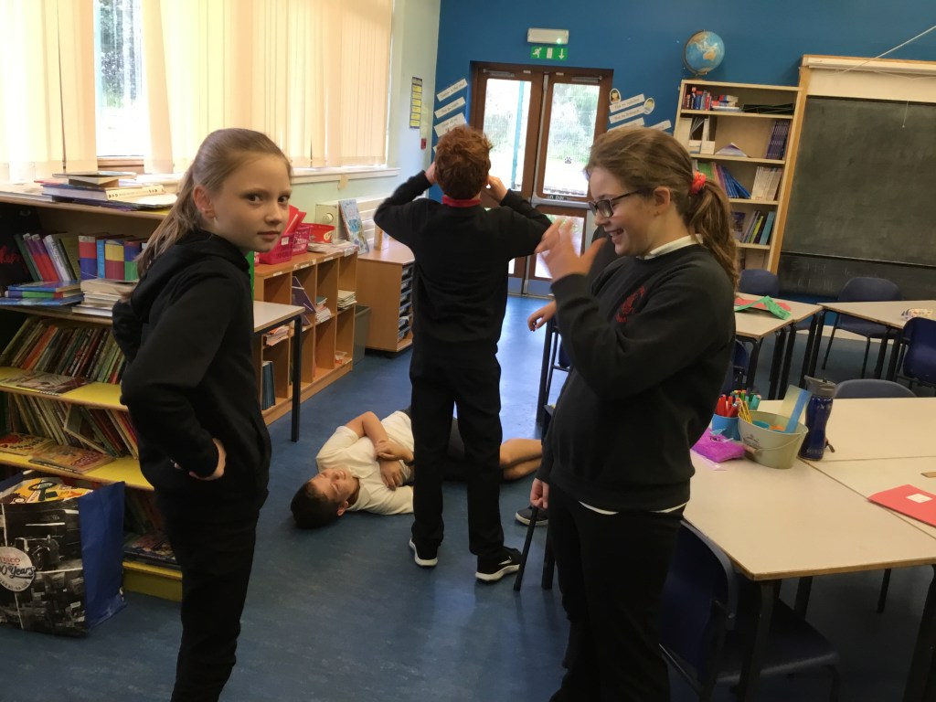 Last week we enjoyed a drama workshop led by Louisa from The Dramabox. We started off playing a circle game called “Whoosh!” We had to listen carefully and react quickly to stay in the game. We also discussed improvisation, and how this can only work if everyone involved responds positively as well as creatively (2 of our school values!) Louisa demonstrated how to do this with one of our brave P7s.